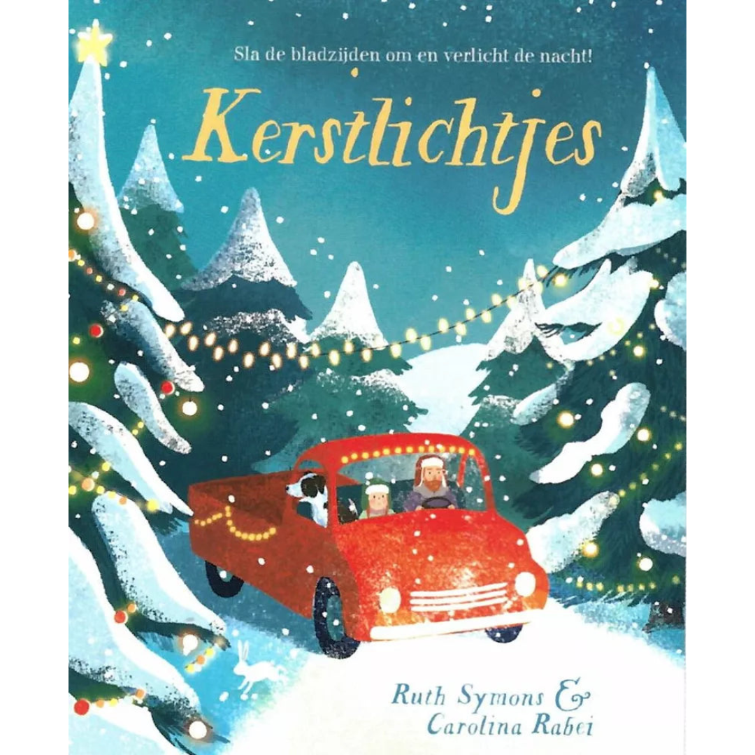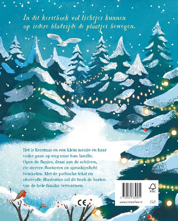 Kerstlichtjes is een kartonboek met flapjes en wieltjes waarmee de lichtjes net echt lijken! Papa en het meisje rijden naar huis voor kerst, rijd jij met ze mee? Open het hek en zie de koplampen schijnen. Draai aan het wiel en zie het Noorderlicht.