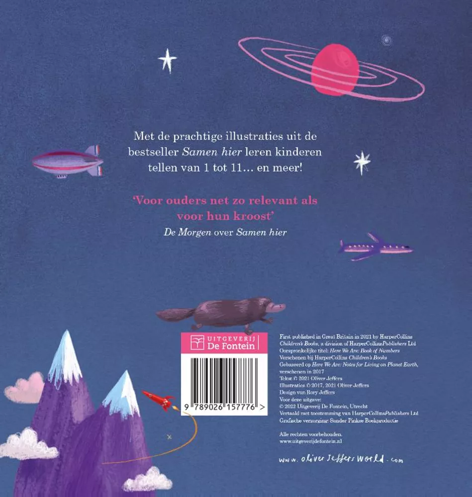Met de prachtige illustraties uit de bestseller Samen hier leren kinderen tellen van 1 tot 11, om af te sluiten met ‘heel veel’ sterren en… ‘oneindig veel’ liefde.