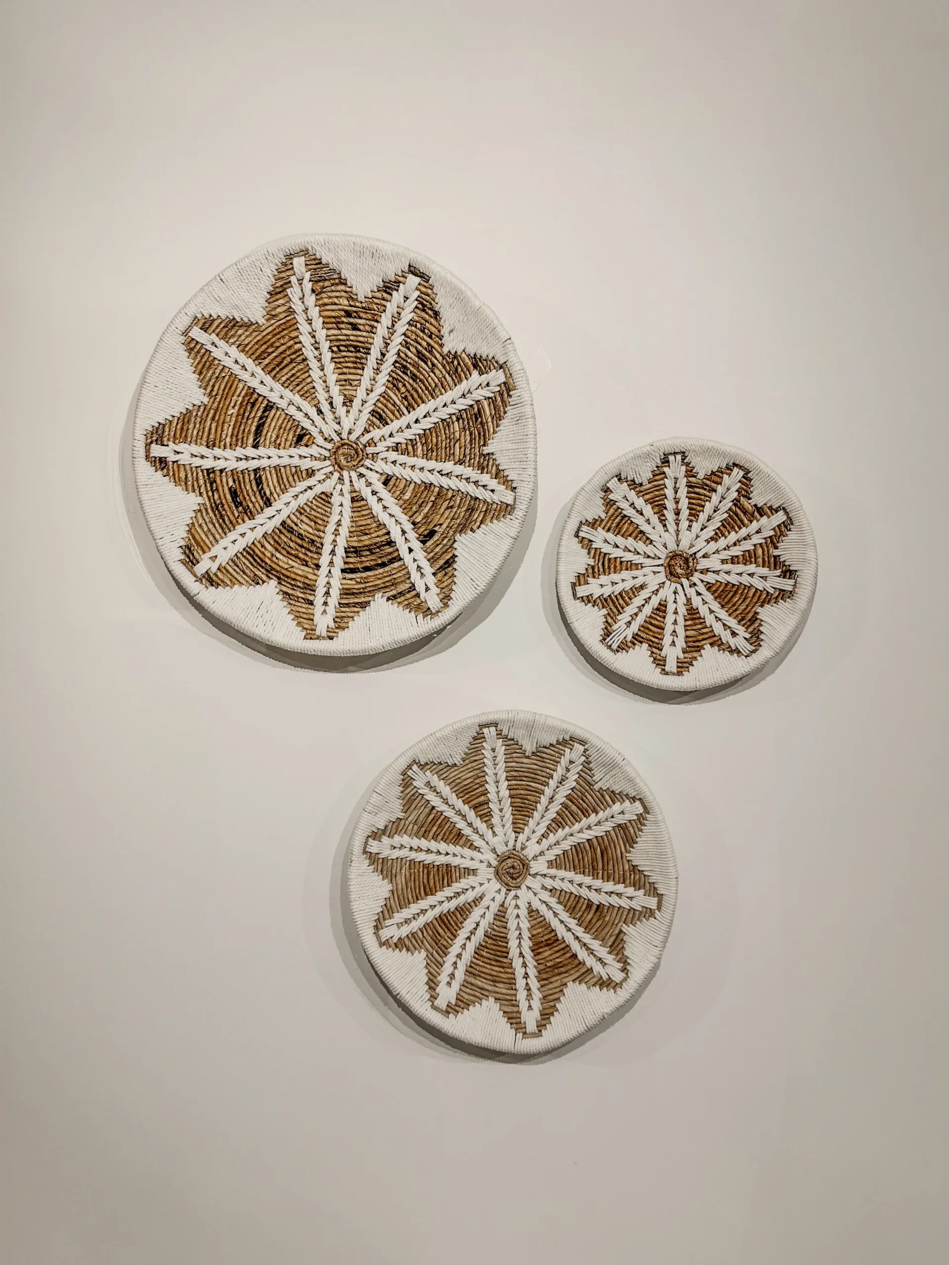 De wanddecoraties zijn beschikbaar in drie maten (30 cm, 40 cm en 50 cm), zodat je de perfecte maat kunt kiezen voor je muur. Er zijn vier verschillende designs beschikbaar in ons assortiment, waarmee je kunt variëren en combineren voor een dynamisch effect. Deze schalen zijn ook prachtig te combineren met andere wanddecoraties, zoals raffia of schelpen decoraties, voor een speelse mix van texturen en stijlen.